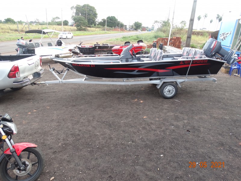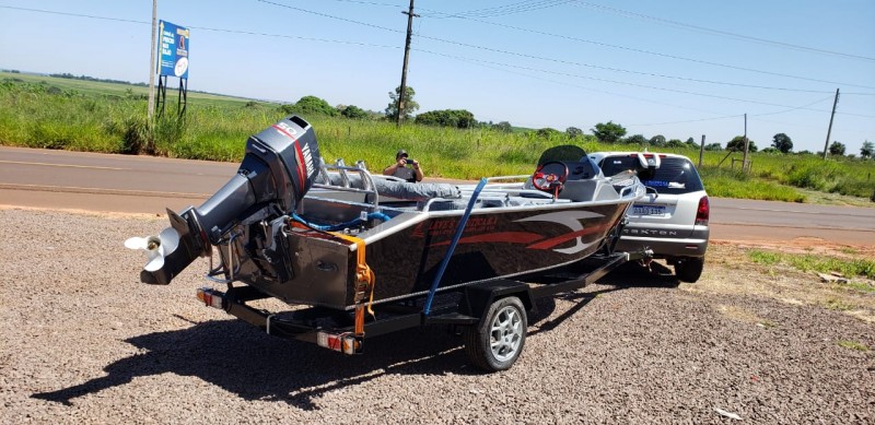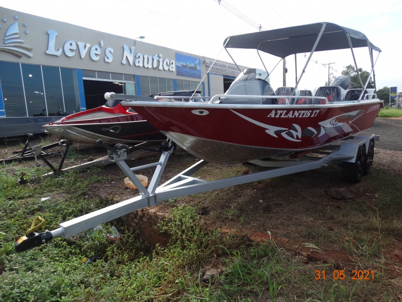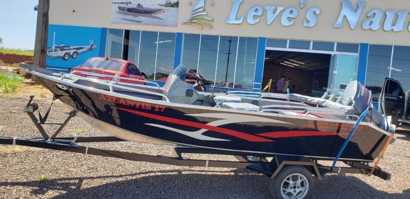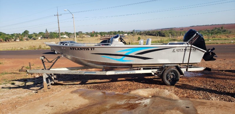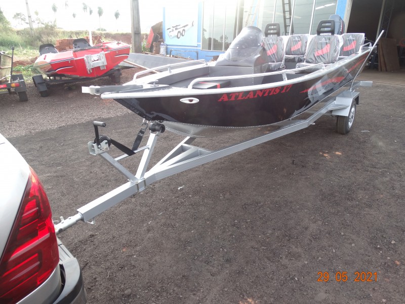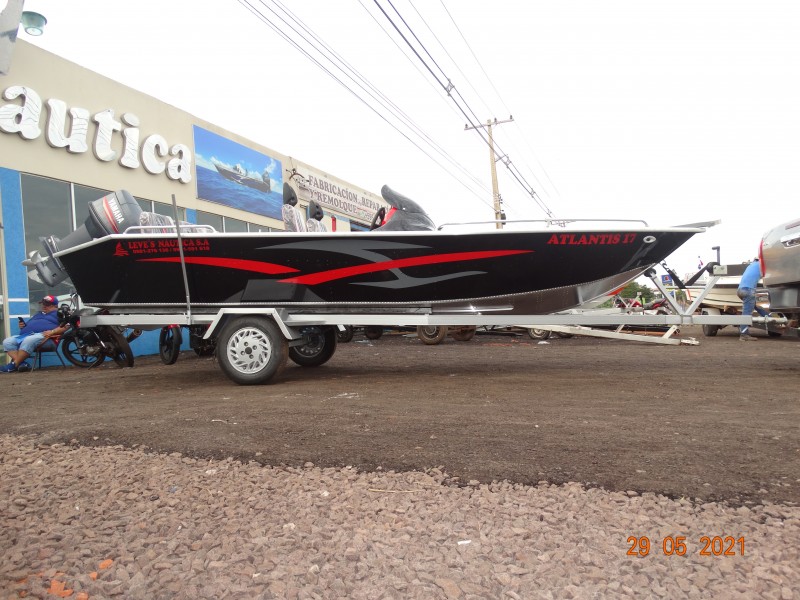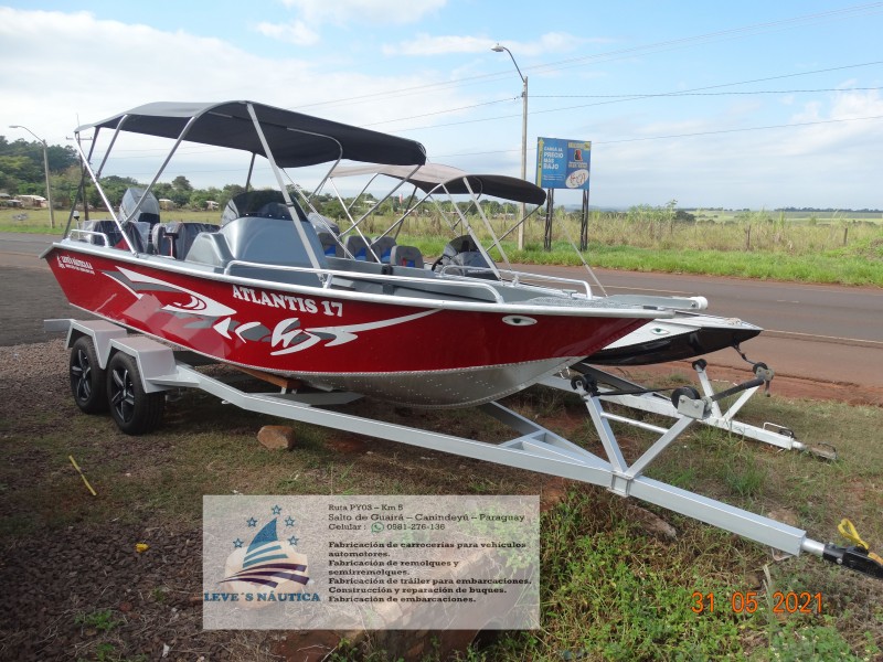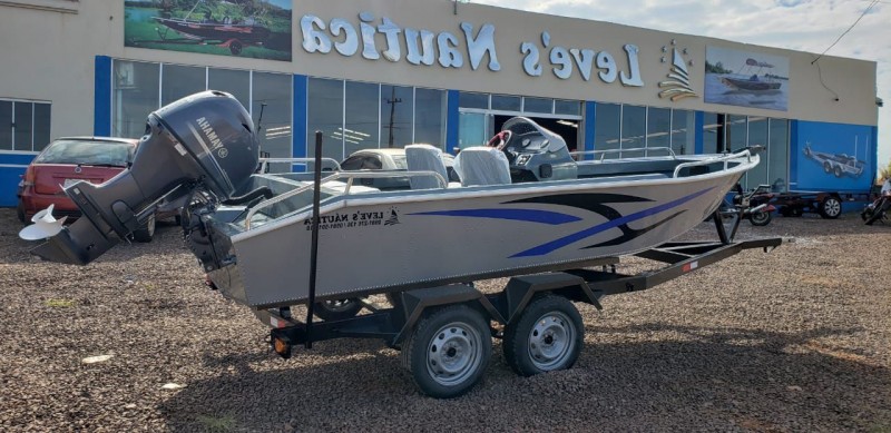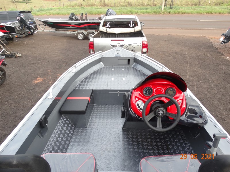 Embarcación fabricada con Duro Aluminio Naval, Una Consola de fibra con parabrisas en acrílico, dos asientos giratorios tipo recaro para el piloto y el copiloto, dos asientos laterales de proa, tres asientos traseros tapiados de una pieza, conservadora incorporada, compartimento en la parte trasera para guardar tanques auxiliares y bateria, piso de chapa de aluminio antideslizante, porta cañas laterales. Opcionales: Color y Toldo rebatible.
