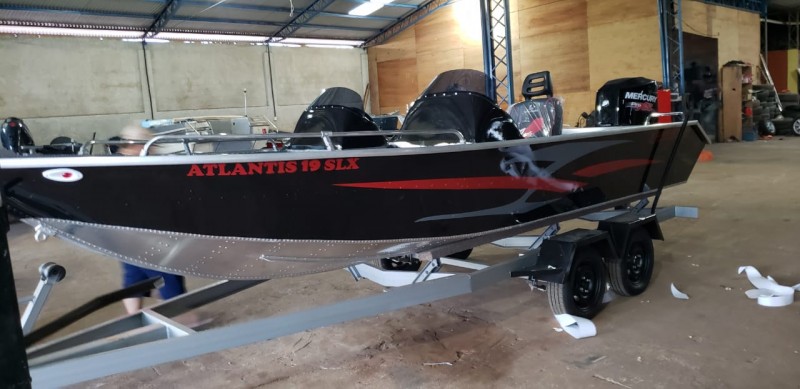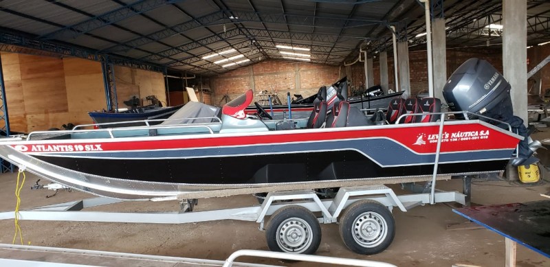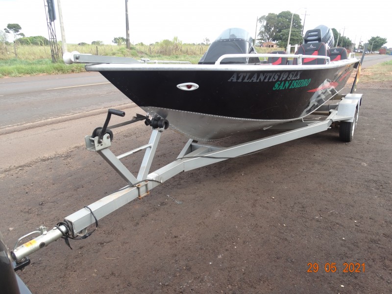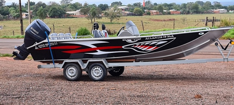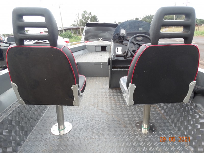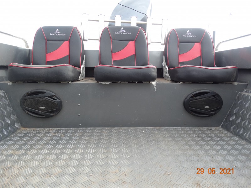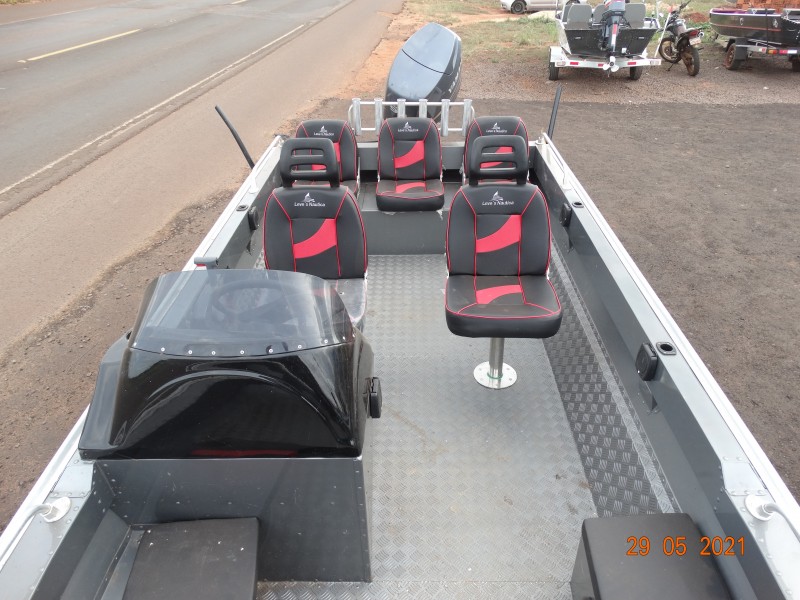 Embarcación fabricada con Duro Aluminio Naval, Una Consola de fibra con parabrisas en acrílico, dos asientos giratorios tipo recaro para el piloto y el copiloto, dos asientos laterales de proa, tres asientos traseros tapiados de una pieza, conservadora incorporada, compartimento en la parte trasera para guardar tanques auxiliares y bateria, piso de chapa de aluminio antideslizante, porta cañas laterales. Opcionales: Color y Toldo rebatible para sombra.